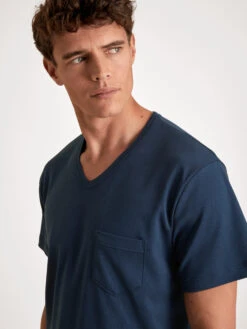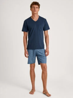 Kurz-Pyjama|aus 100% Baumwolle|in Interlock-Bindung|Shortsleeve mit V-Neck, aufgesetzte Brusttasche|unifarbenes Oberteil mit Paspelierungen|gemusterte Shorts mit stoffbezogenem Bund