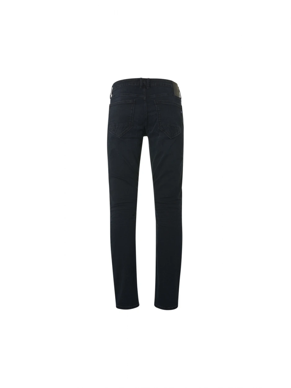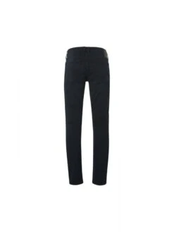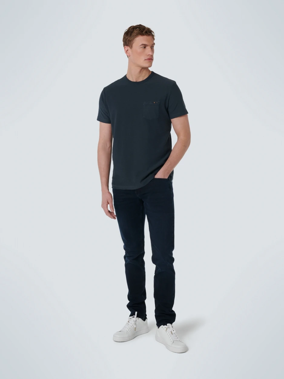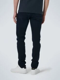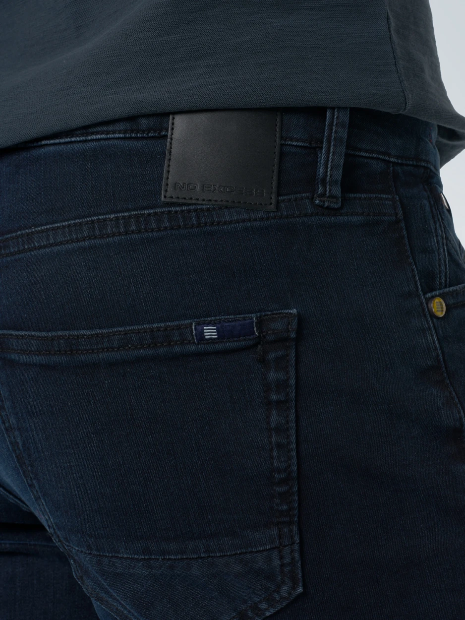These regular fit jeans have a regular thigh, straight leg and comfort fixed mid waistband. The styling is based on a classic 5 pocket jeans and have an extra hidden sixth pocket. They come in a dark black colour with slightly worn effect on the tigh to create a cool look. Suiting our visual identity we created a new look and feel for the finishings of our denim. The labelling, metal trims and back patch are all freshly designed in a color theme which refers to authentic denim from the sixties and seventies.