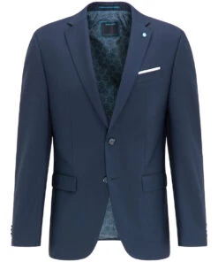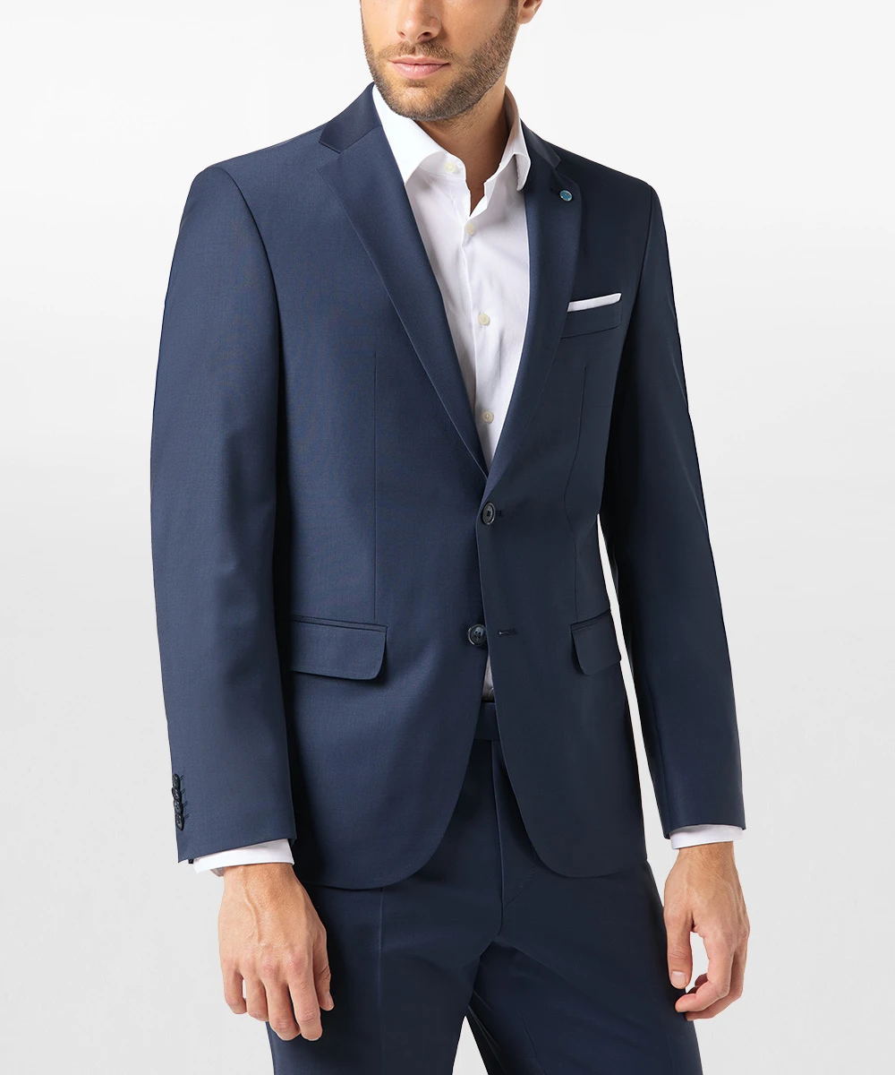 Sakko mit Seitenschlitzen hinten, vollgefüttert aus Stretchfutter und elastischer Rückenabtrennungen an dem Armloch, Ärmelschlitze mit je 4 Kissing-Button, schließt mit 2-Knopf.