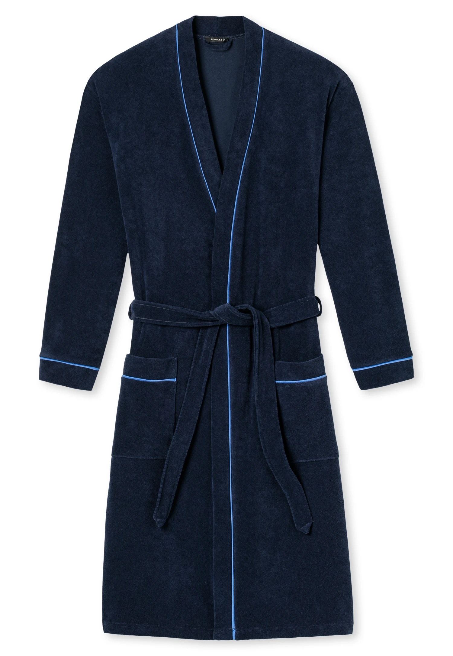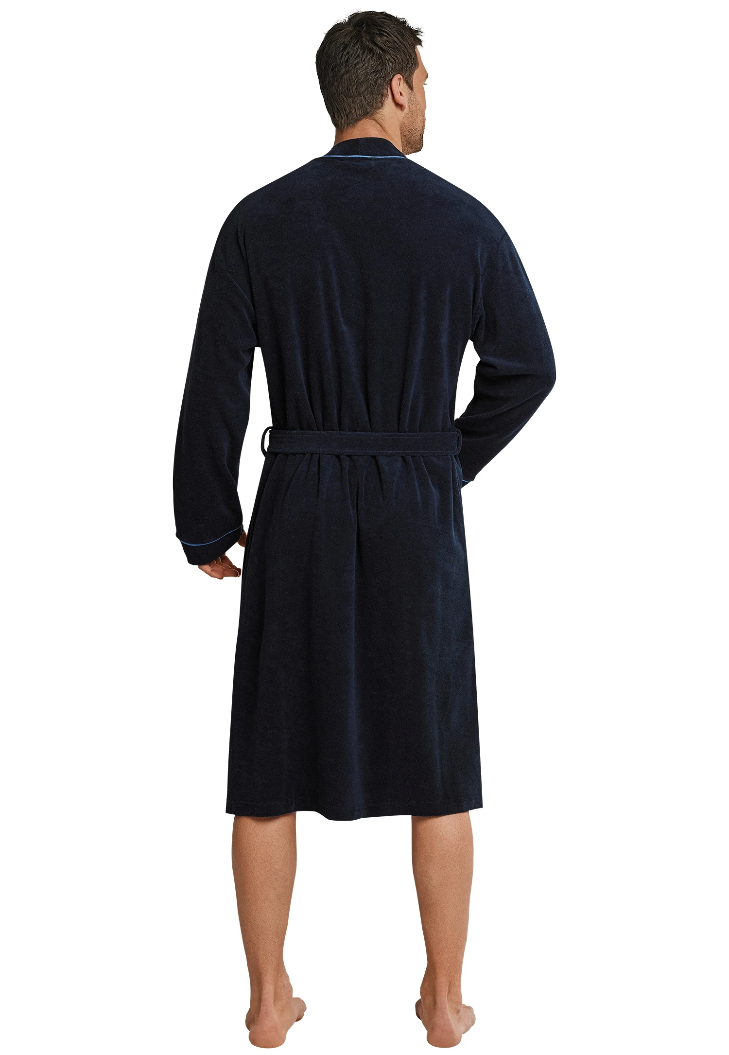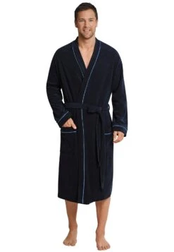 navy-blauer Herren-Bademantel, aus der SCHIESSER-Serie Original Classics, mit kontrastfarbenen Paspeln am Leistenabschluss, an den Taschen sowie an den Ärmelabschlüssen, zwei aufgesetzte Taschen im vorderen Bereich, Bindegürtel, praktischer Aufhänger im inneren Nackenbereich, in angenehm weicher, leichter Frottee-Qualität