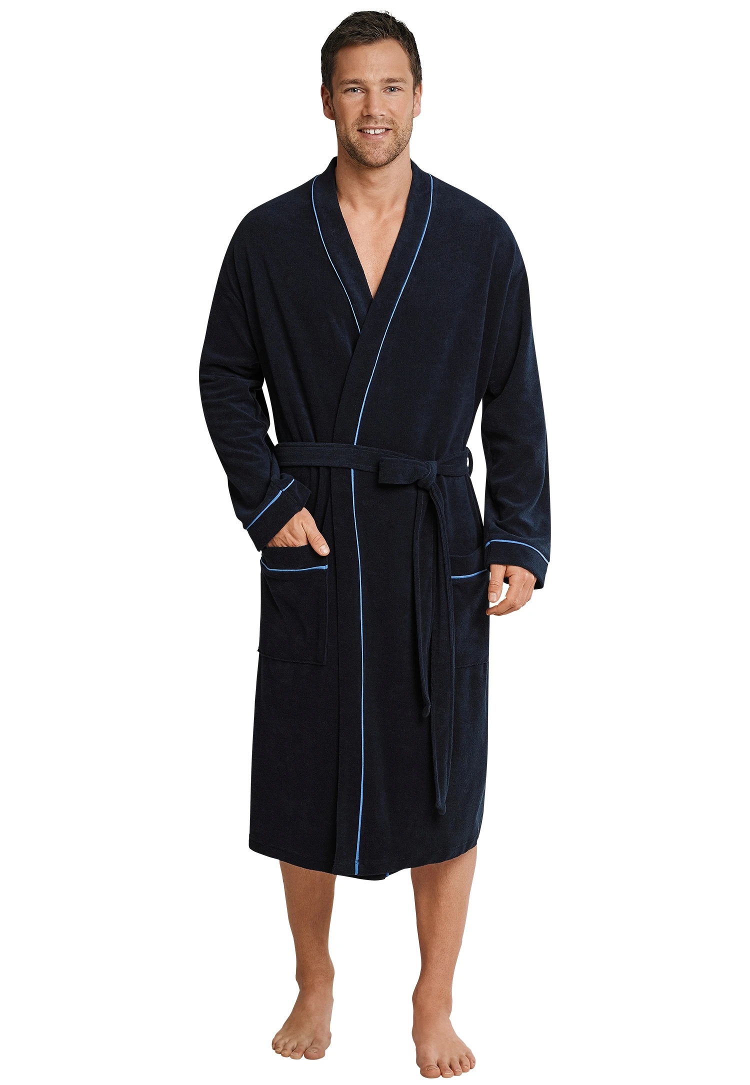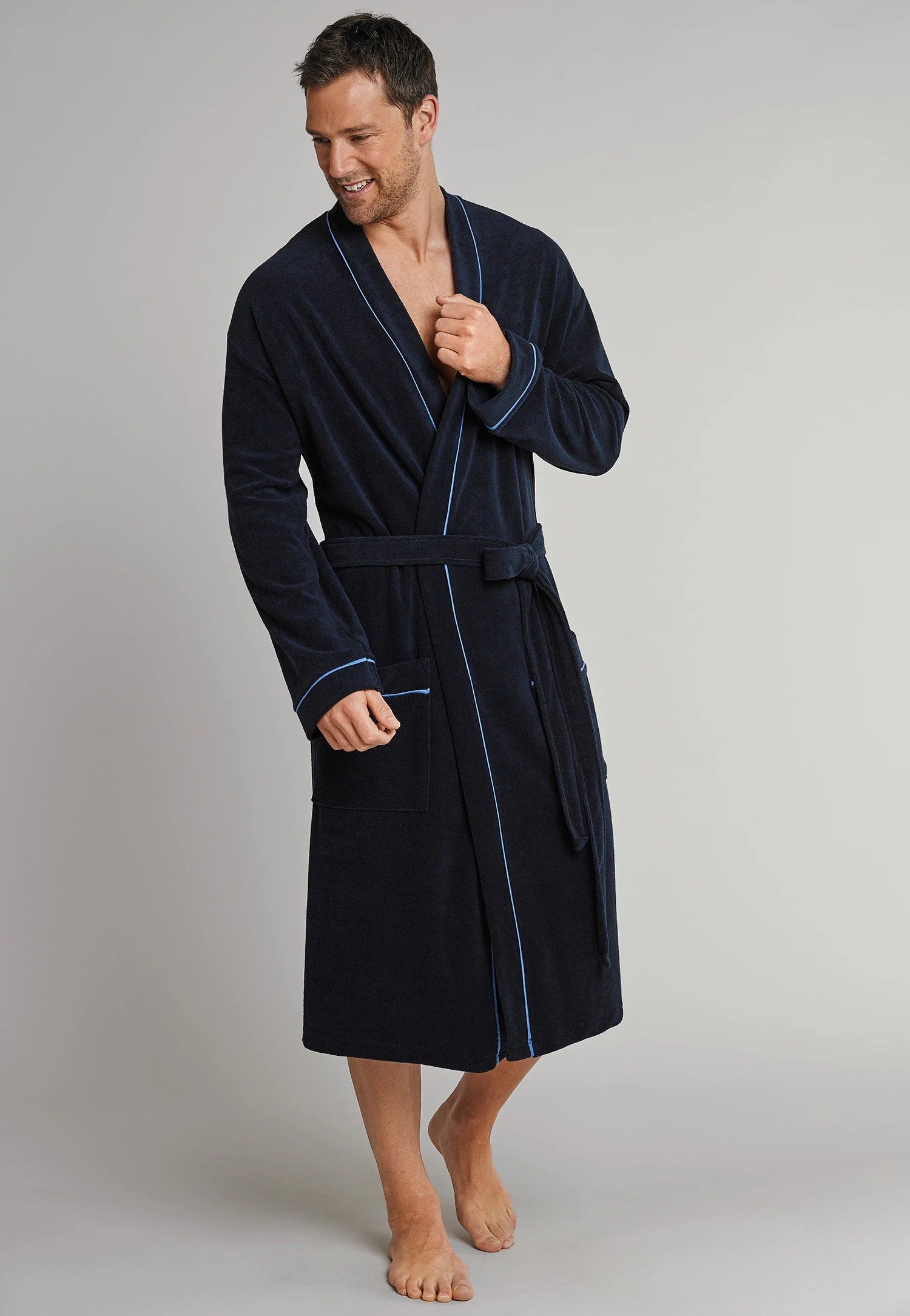 Stilvoll und besonders komfortabel überzeugt dieser navy-blaue Bademantel anspruchsvolle Herren. Hellblaue Paspeln schenken dem Mantel einen eleganten Akzent, der mit den beiden aufgesetzten Taschen sowie einem legeren Bindegürtel harmonisch abgerundet wird. In leichtem, hochwertigem Frottee passt er bequem in jede Reisetasche und ist somit sowohl unterwegs als auch nach dem heimischen Wohlfühlbad der perfekte Begleiter!