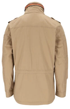 Die Herrenjacke zeigt sich im authentischen Army-Stil. Während ein dekorativer Reißverschluss den hohen Stehkragen gelungen auflockert, unterstreichen Schulterriegel und markante Pattentaschen den Military-Look des Designs gelungen. Um optimal vor Wind und Wetter zu schützen, ist der Reißverschluss der Colonel nicht nur unterlegt, sondern auch mit einer geknöpften Abdeckleiste versehen. Im Inneren besticht die Herrenjacke durch ein leichtes Teilfutter, drei praktische Taschen und einen Tunnelzug in der Taille.